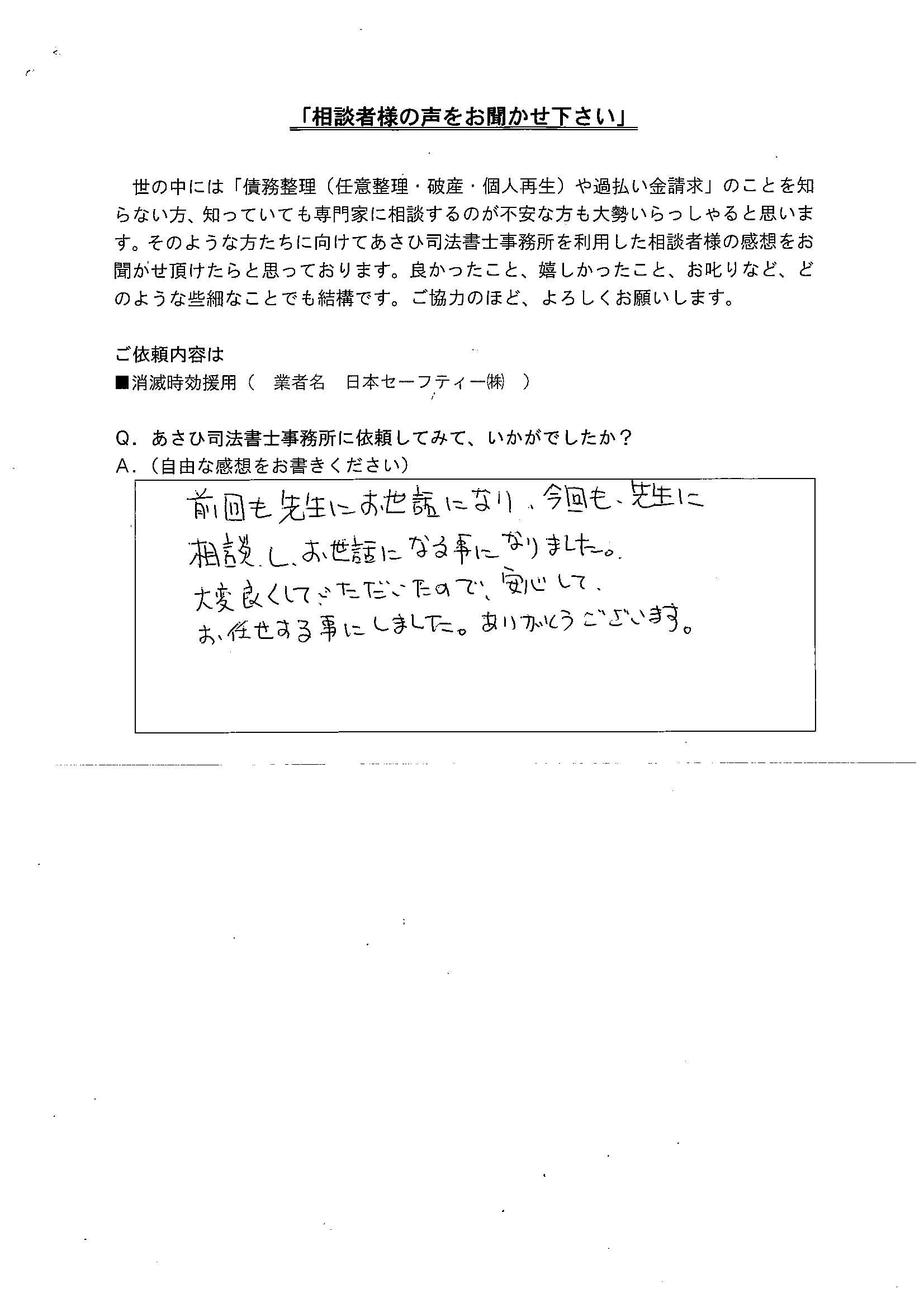 消滅時効援用(業者名 日本セーフティー㈱) □過払い金請求 □自己破産 □個人再生