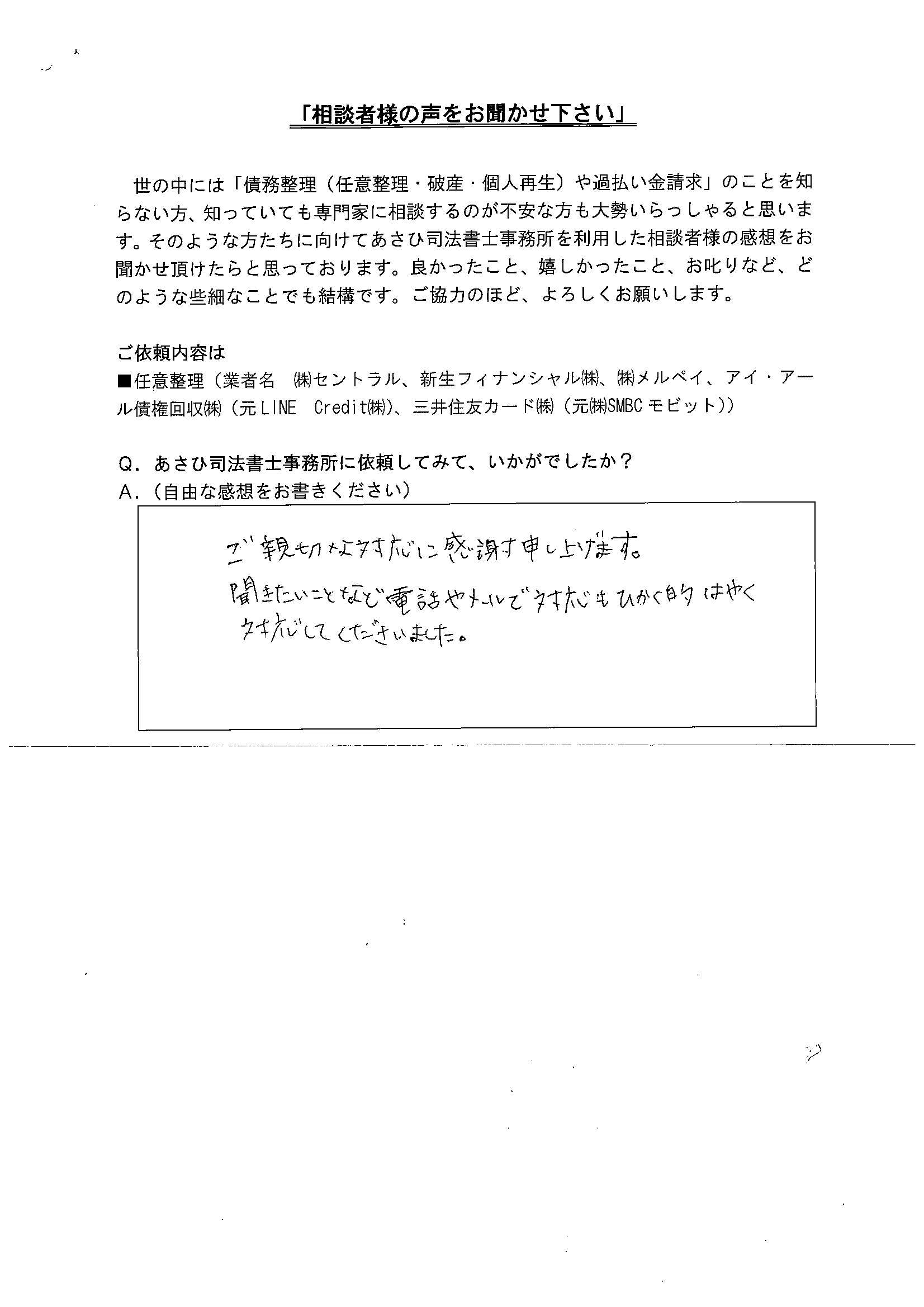任意整理(業者名 ㈱セントラル、新生フィナンシャル㈱、㈱メルペイ、アイ・アール債権回収㈱(元LINE Credit㈱)、三井住友カード㈱(元㈱SMBCモビット))『ご親切な対応に感謝申し上げます。』(40代)|あさひ司法書士事務所を利用した感想  (更新日:2026.01.14)