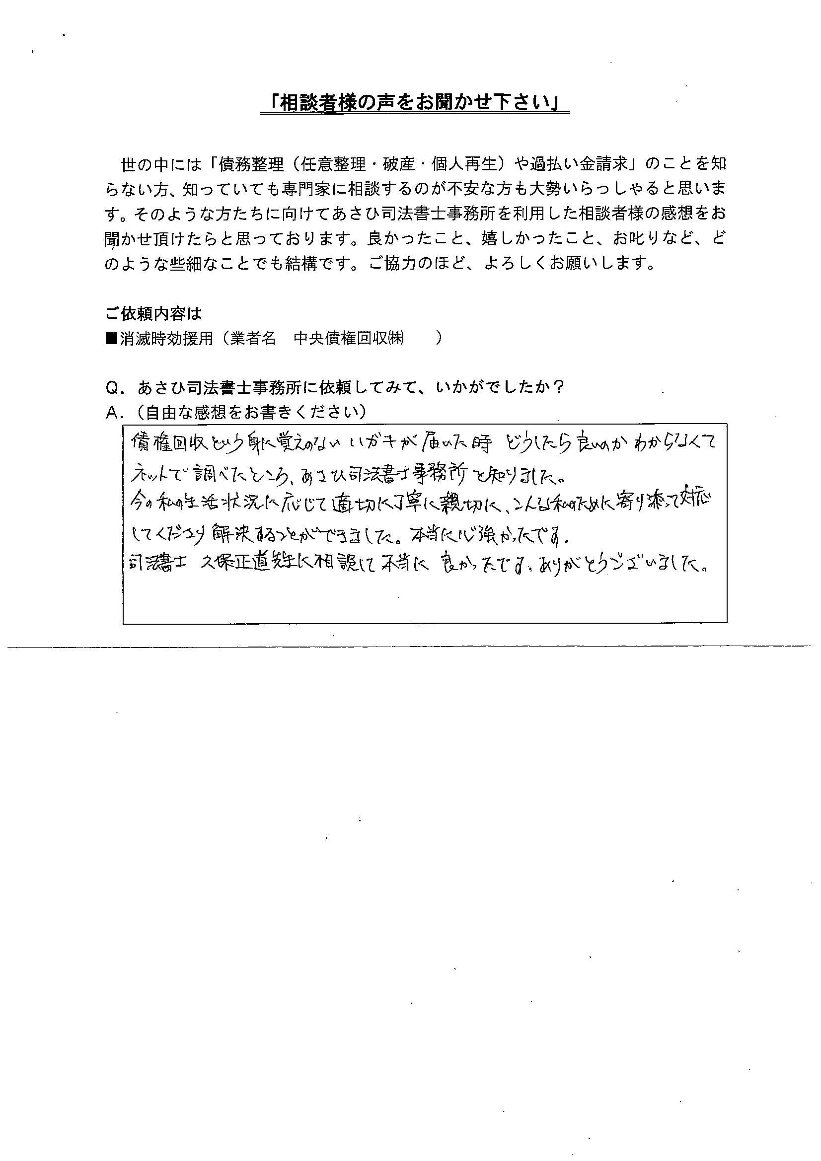 消滅時効援用(業者名 中央債権回収㈱)『今の私の生活状況に応じて適切に丁寧に親切に、こんな私のために寄り添って対応』(50代)|あさひ司法書士事務所を利用した感想  (更新日:2026.01.21)