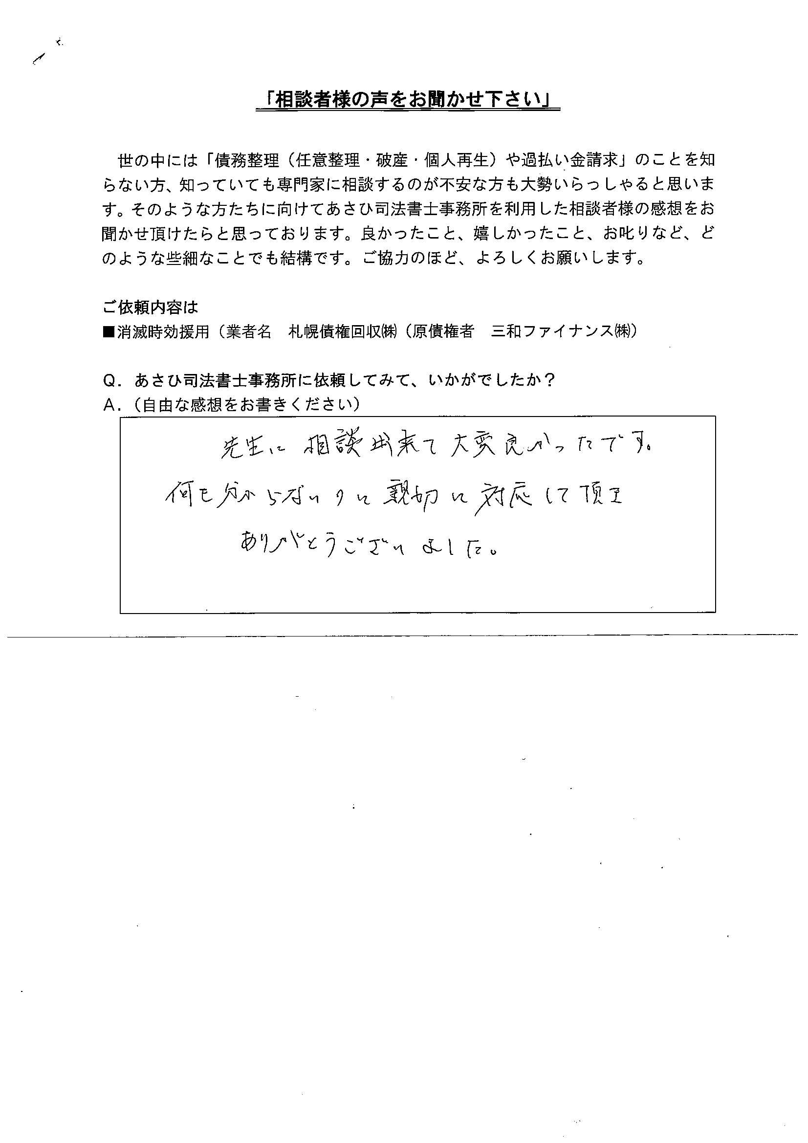 A. 先生に相談出来て大変良かったです。何もわからないのに親切に対応して頂きありがとうございました。