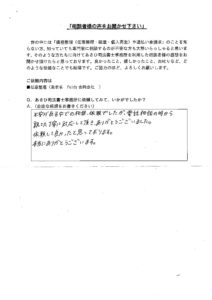 A. 不安がある中での相談、依頼でしたが、電話相談の時から親切、丁寧に対応して頂き、ありがとうございました。依頼して良かったと思っております。本当にありがとうございます。
